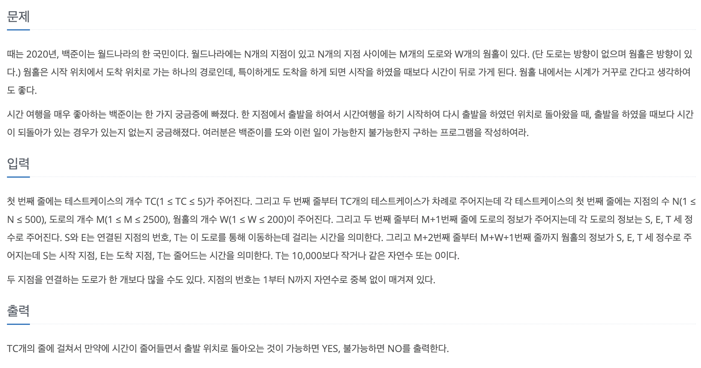 해당 문제는 양방향 간선(도로)와 단방향 간선(웜홀)을 입력받아 음수 사이클이 발생하는 지에 대해 알아보는 문제입니다.
