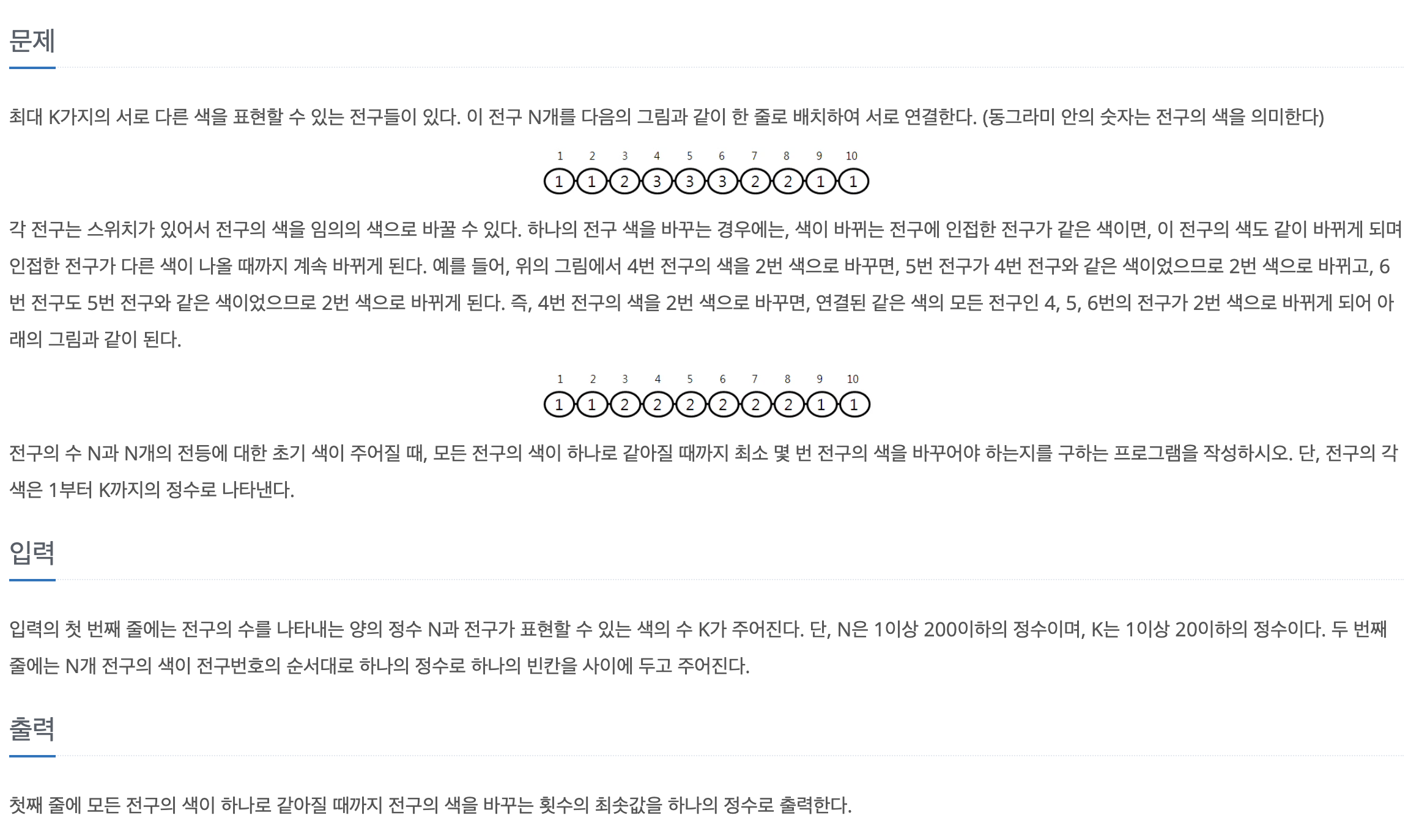 N개의 전구가 일렬로 배치되어 있고, 각 전구는 1부터 K까지의 색으로 표현됩니다. 한 번에 연속된 같은 색의 전구 그룹을 선택해 다른 색으로 변경할 수 있을 때, 모든 전구를 같은 색으로 만드는 최소 변경 횟수를 구하는 문제입니다.