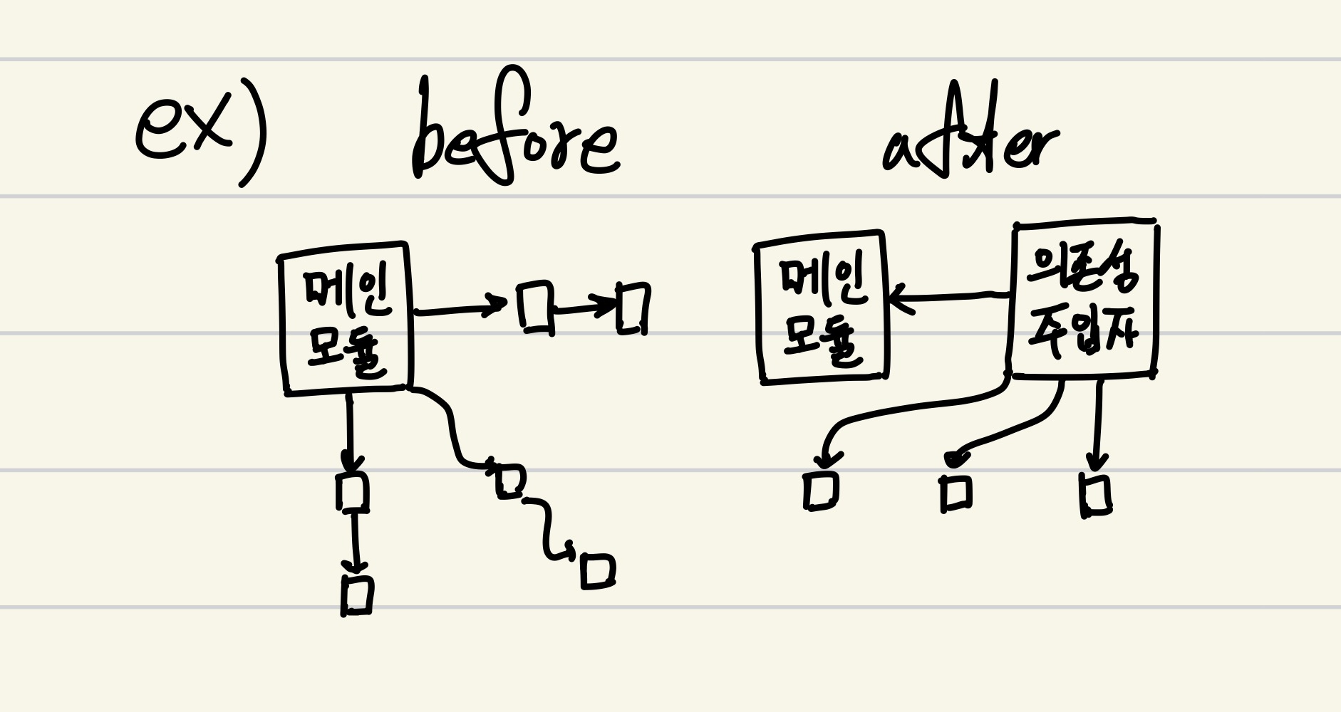 - 또한, 둘 다 추상화에 의존해야 하며, 이때 추상화는 세부사항에 의존하지 말아야함.