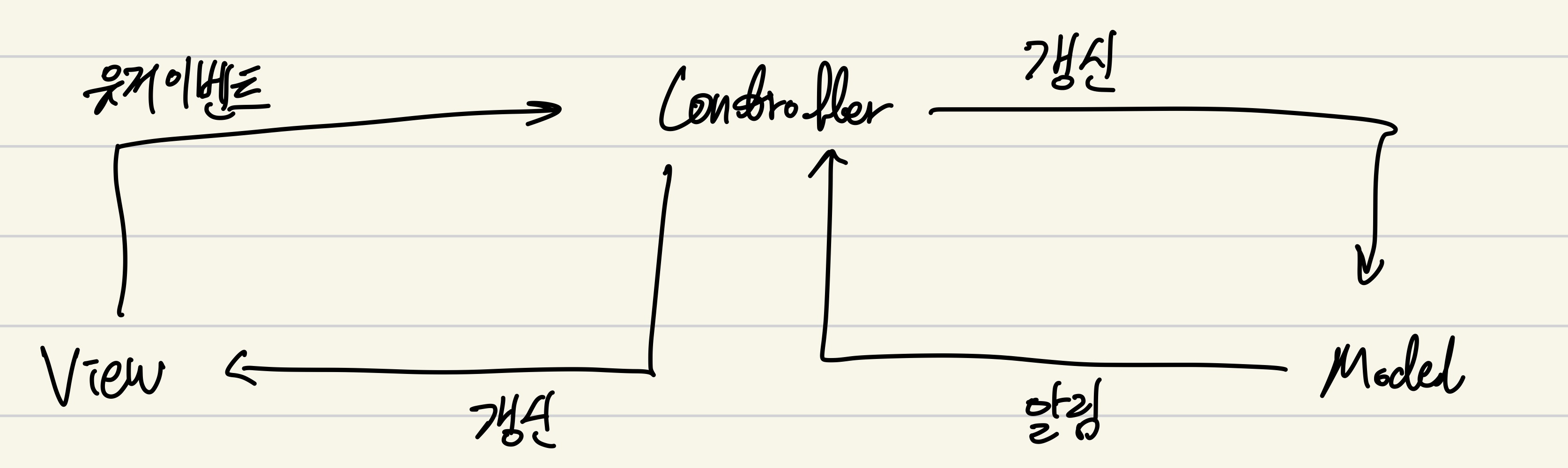 컨트롤러 : 하나 이상의 모델과 하나 이상의 뷰를 잇는 다리 역할을 하며, 이벤트 등 메인로직 담당