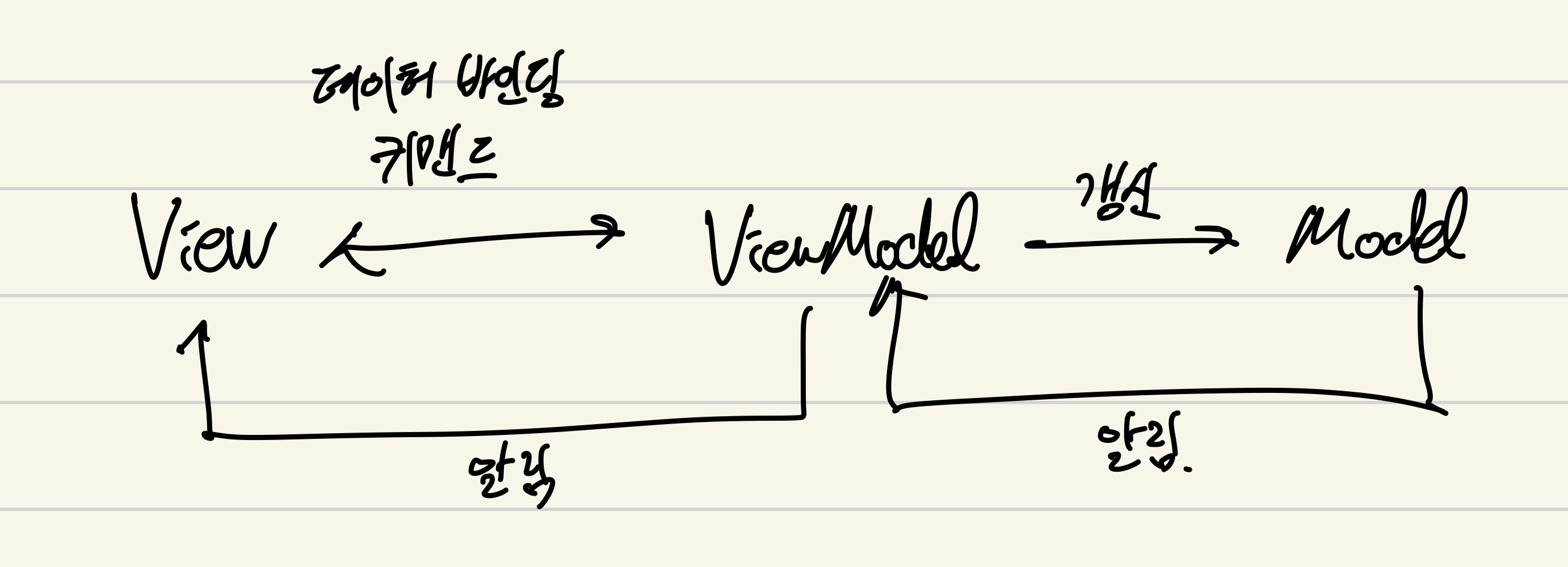 - 뷰모델은 뷰를 더 추상화한 계층이며, MVVM 패턴은 MVC 패턴과는 다르게 커맨드와 데이터 바인딩을 가지는 것이 특징