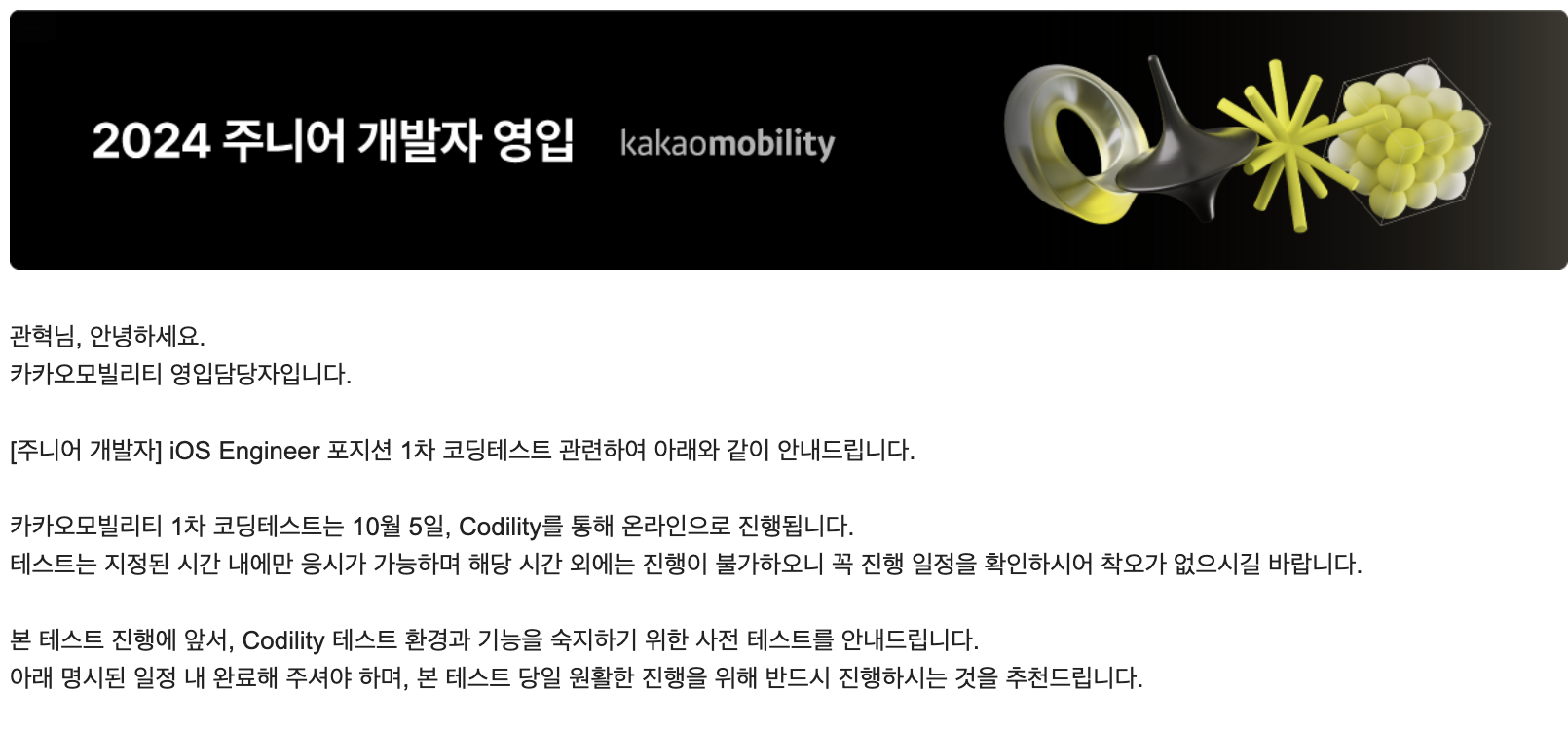 1차 코딩테스트는 10월 5일에 진행했다. ChatGPT의 발전 때문일까? 1차 코딩테스트임에도 불구하고 검색 불가, 외부 IDE 사용 불가 조건이 붙었다. 뭐 나와는 상관없는 항목이라 무시했다.