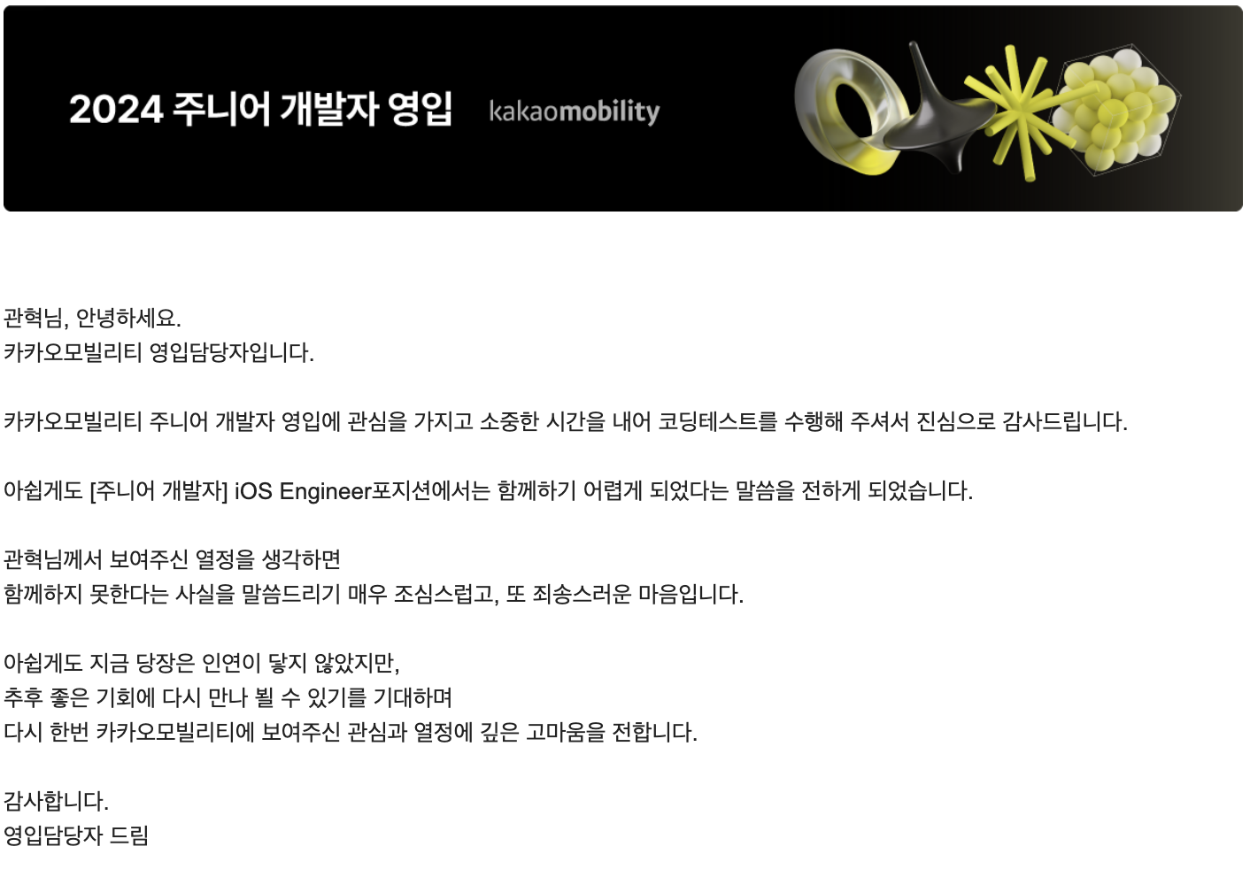 떨어질 걸 알고 있었지만 직접 메일을 받아보니 속이 쓰리다. 그래도 부족하다는 것은 채울 수 있다는 것 아니겠는가. 다시한번 도전해봐야지.