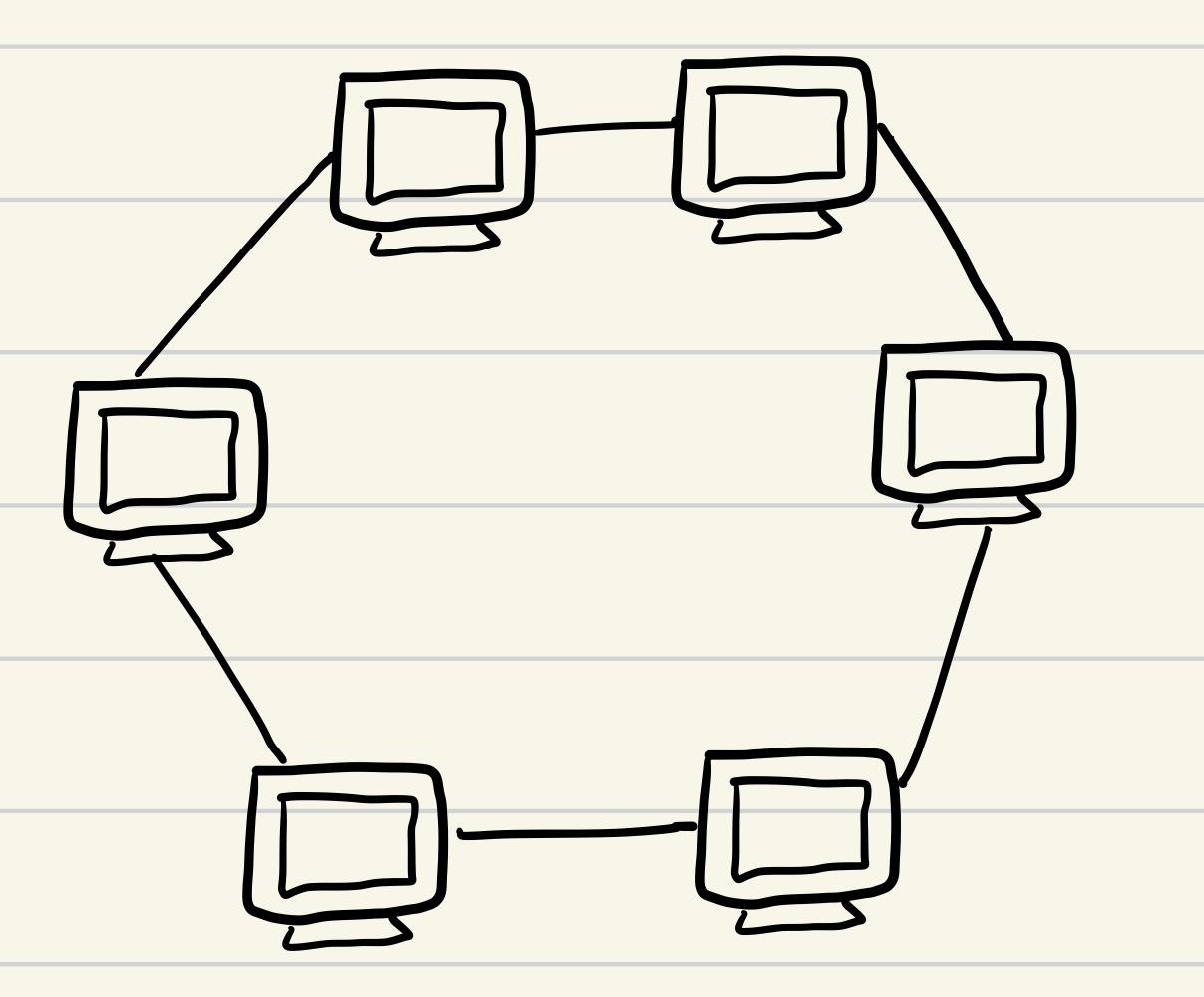 데이터는 노드에서 노드로 이동을 하게 되며, 각각의 노드는 고리 모양의 길을 통해 패킷을 처리함.