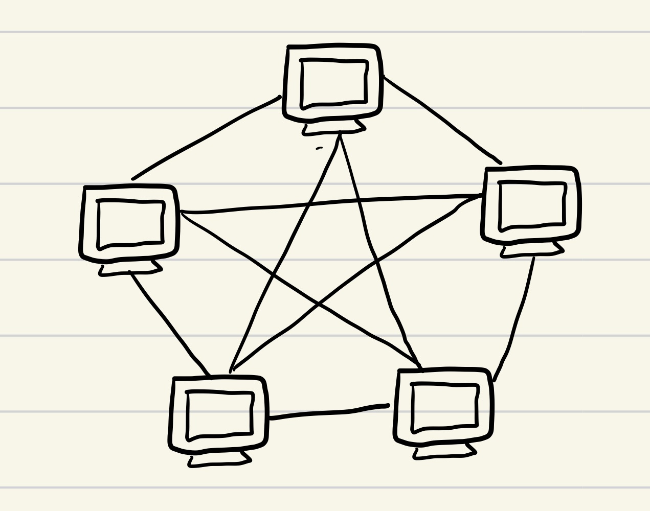 메시(mesh) 토폴로지는 망형 토폴로지라고도 하며 그물망처럼 연결되어 있는 구조임.
